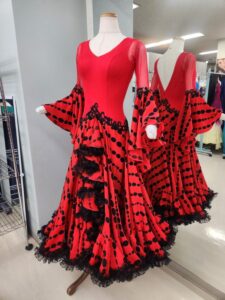 パートナーは、「カポーテ」なのでボリュームのあるスカートが定番。スタンダードドレスのボリュームとは異なる手に持って大きく振れる1枚仕立てのものが良いでしょう。ターンで広がる裾は観客を圧倒し、リーダーとの対比で物語性を強調します。色は赤や黒が主流ではありますが、近年では真っ白やゴールド等、舞台映えを意識した個性的なデザインも増えています。