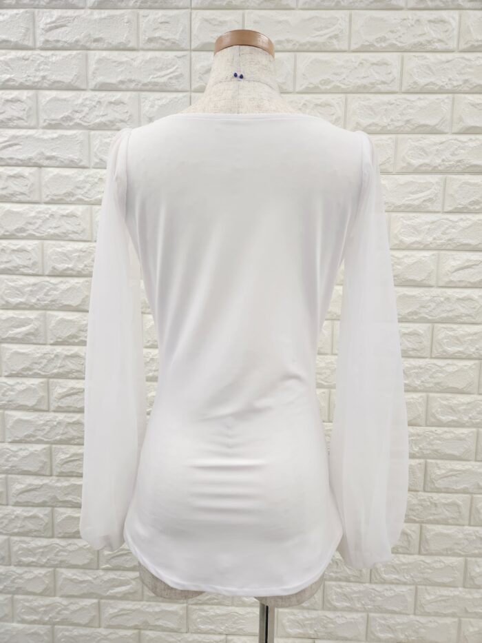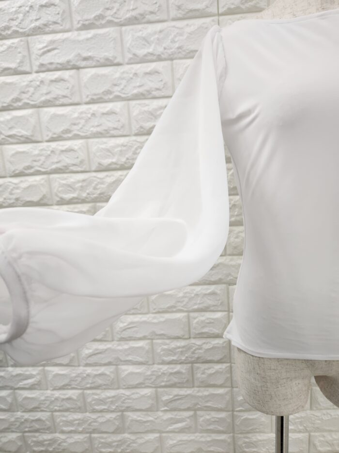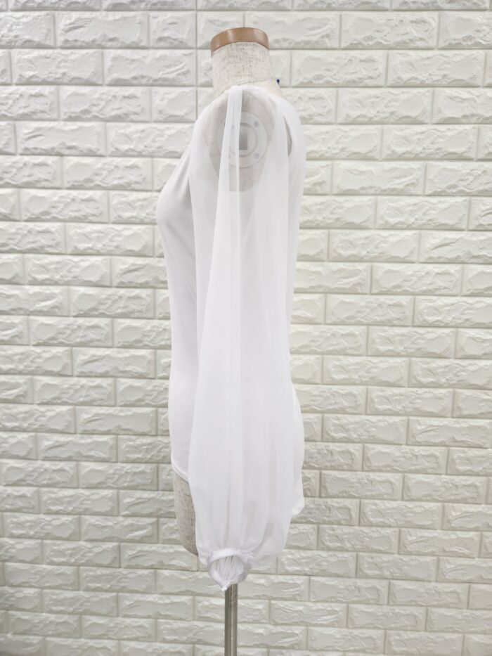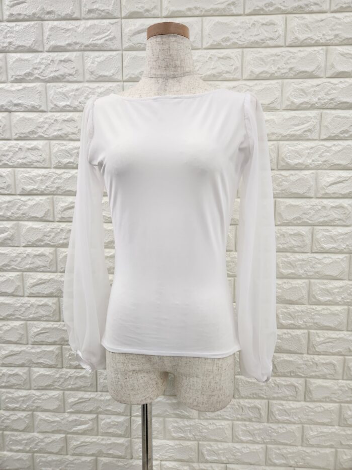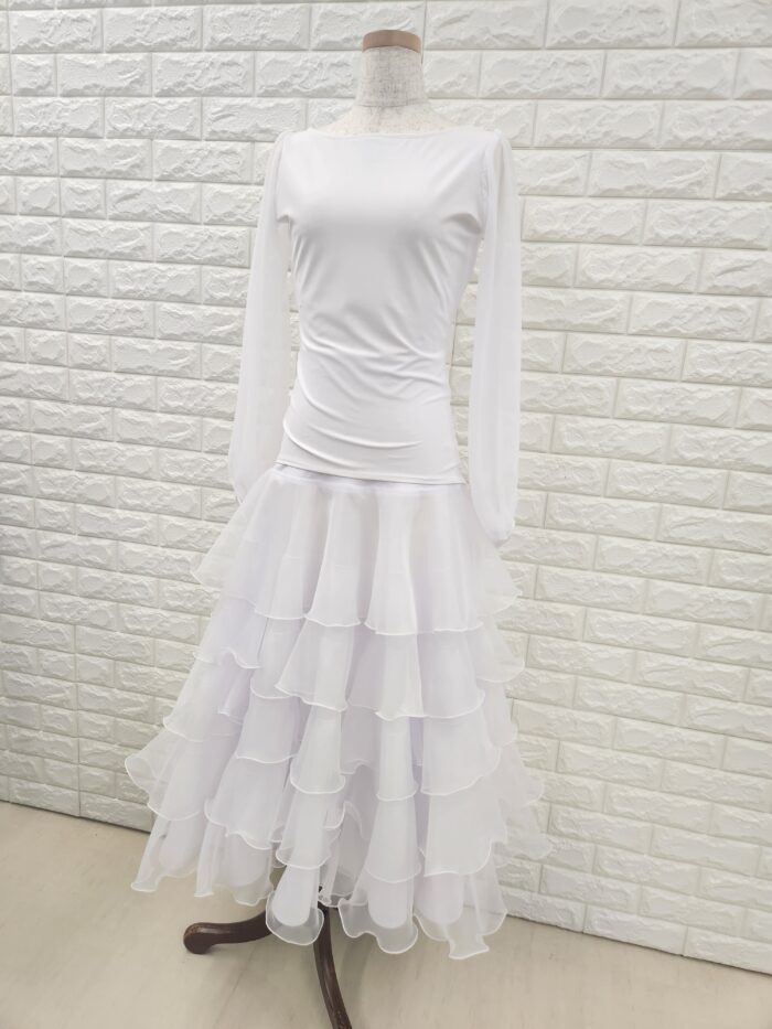 バックスタイルの方が丈が長くなっており、踊っていてもトップスが持ち上がってこない構造となっております。。吸湿速乾と撥水性という特殊加工された高級トリコットとジョーゼット生地で作られております。(写真の白ティアードスカートも製作可能です。)