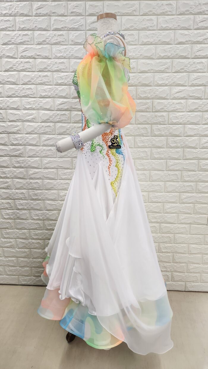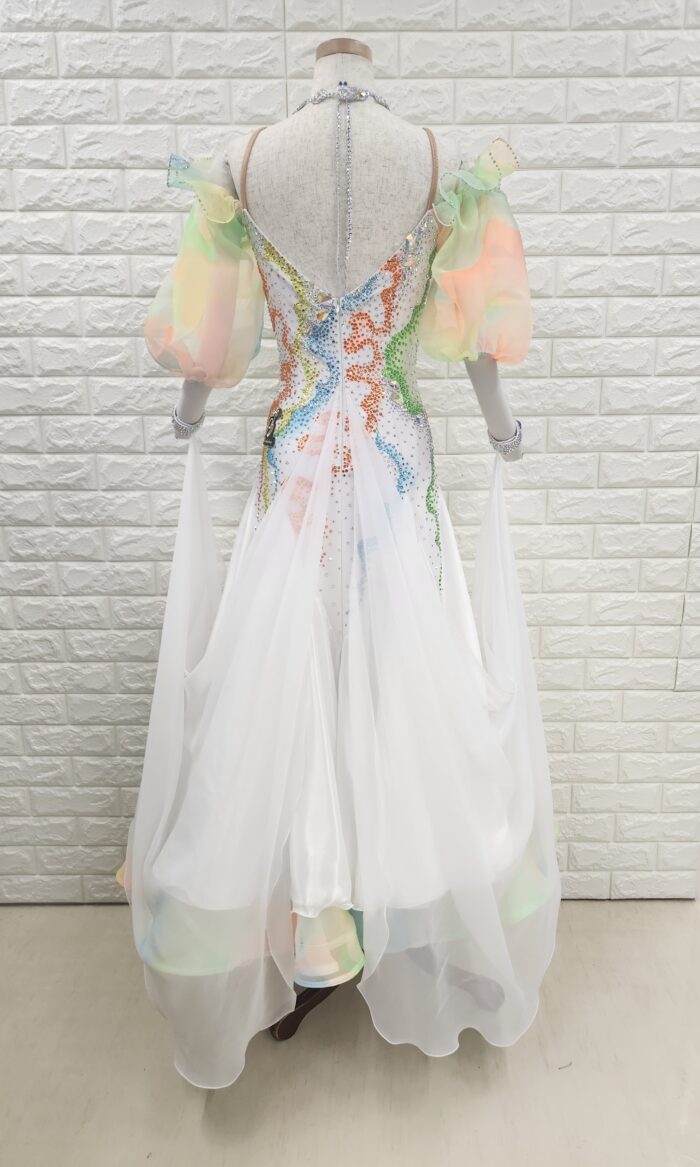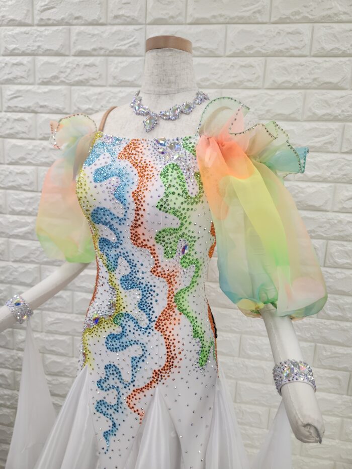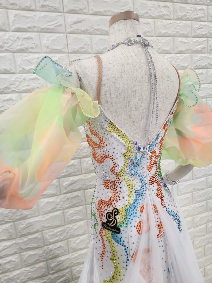 スタッフコメント:バルーン袖が細さをカバーしてくれます。カラフルなビタミンカラーのグラデーションが目を惹きつけます。身長の小柄な方は、簡単に丈つめもできます。大きなウィングフロートはワルツやスローにオススメ。