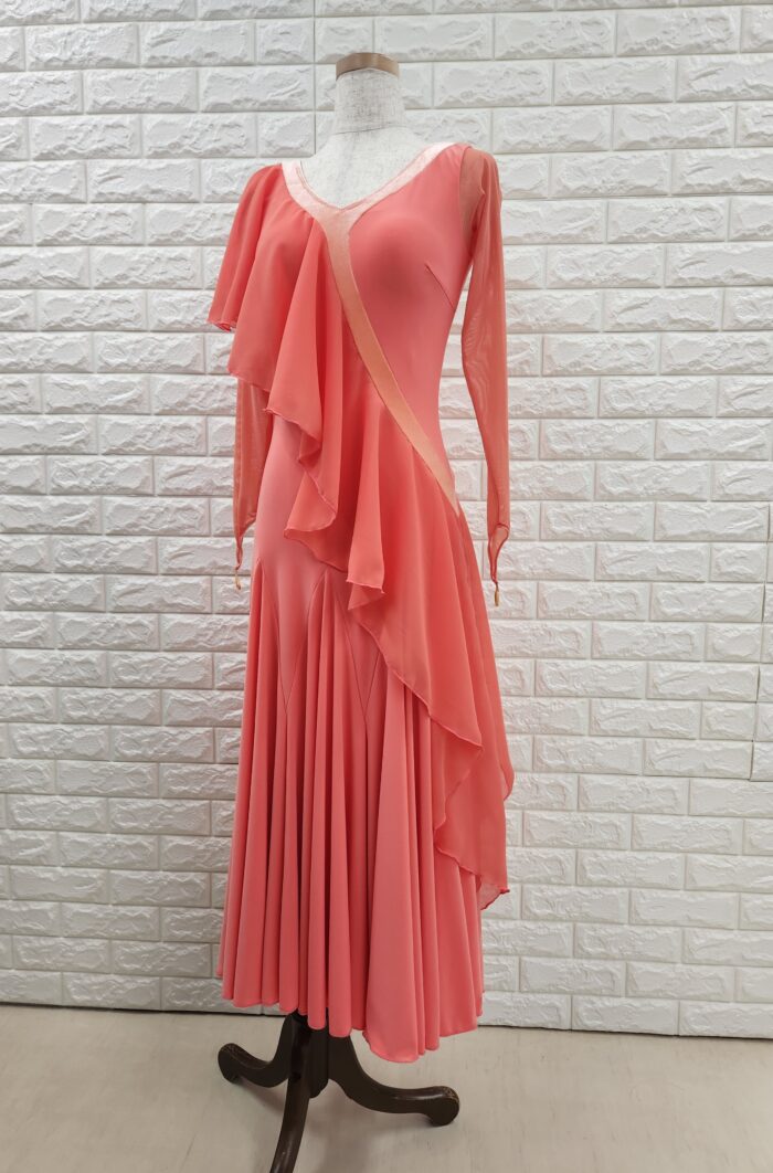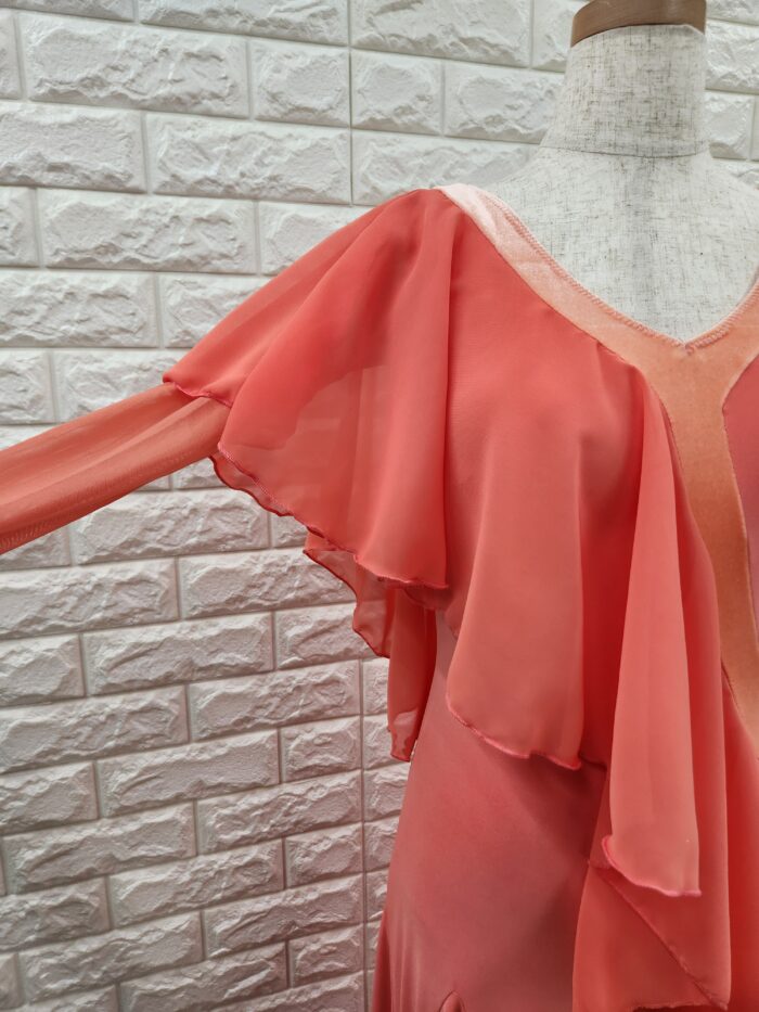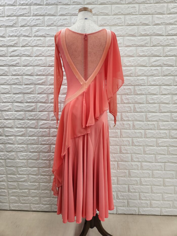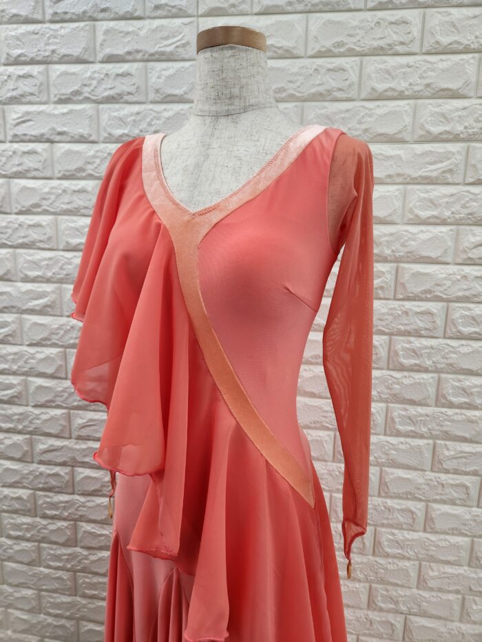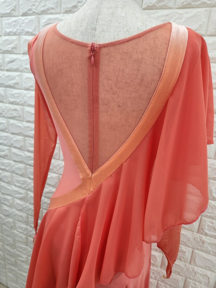 ●スタッフのコメント:オレンジ系の柔らかいお色で、肩から流れるフリルがほっそり効果も演出してくれます。背中の透け部分もオシャレ!