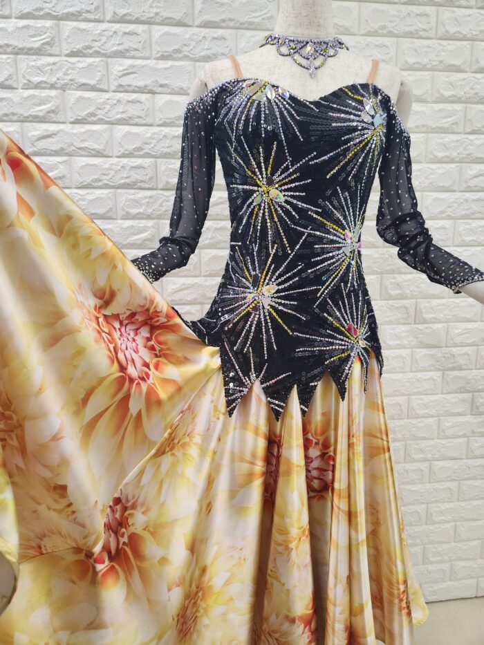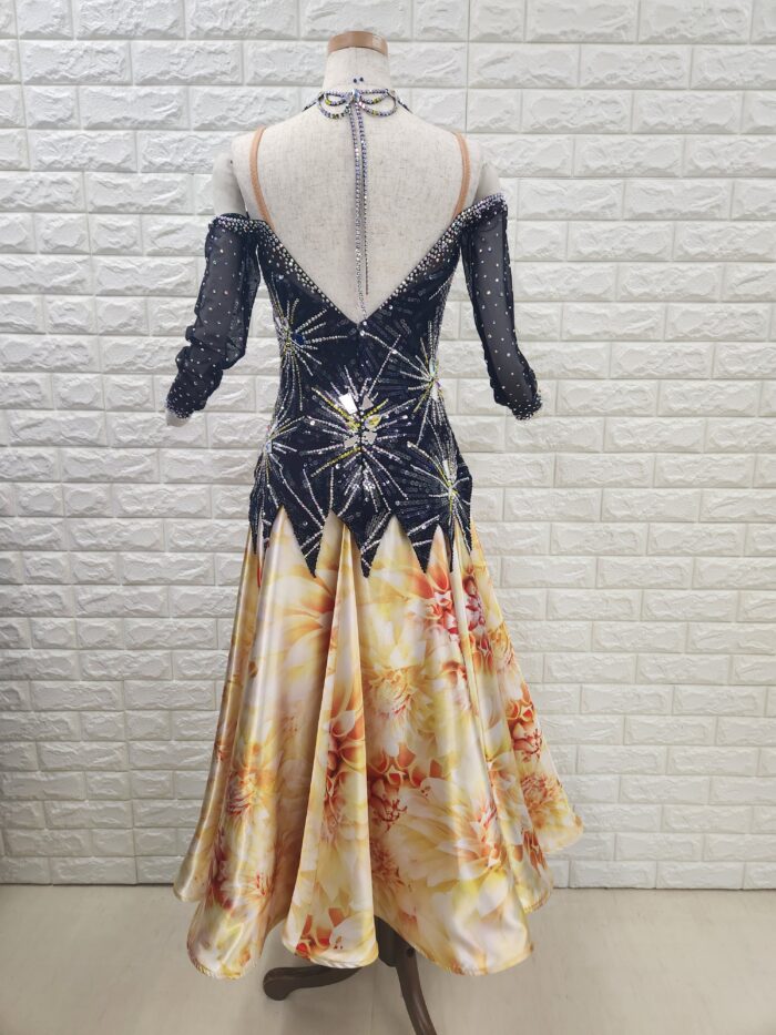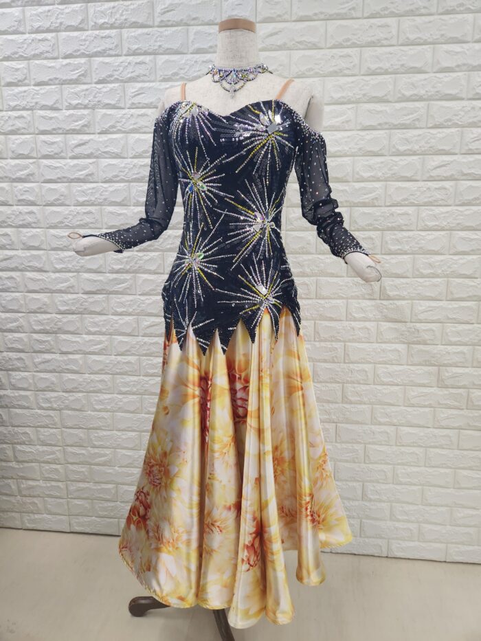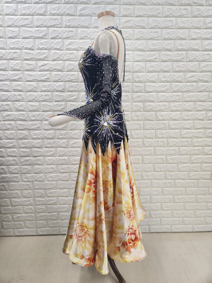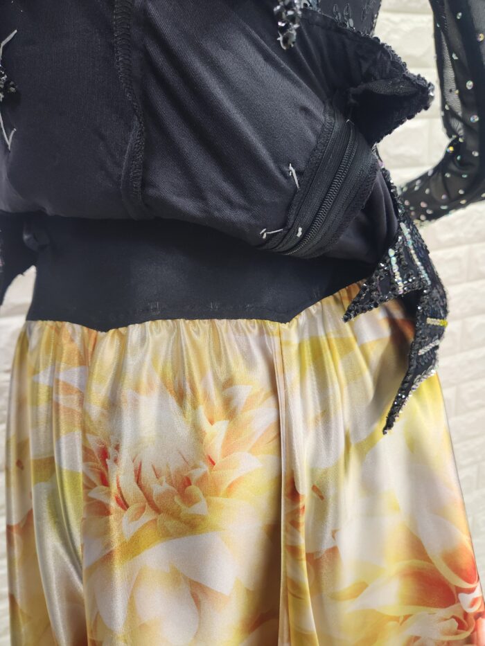 ボディーのスパンを使用した特殊生地が珍しい+花火の様なストーニングが美しい。また、イエローのプリントサテン生地が品よく全体をスッキリとさせてくれます。スカートははくタイプなので、ウエスト部分で多少丈を調節できます。
