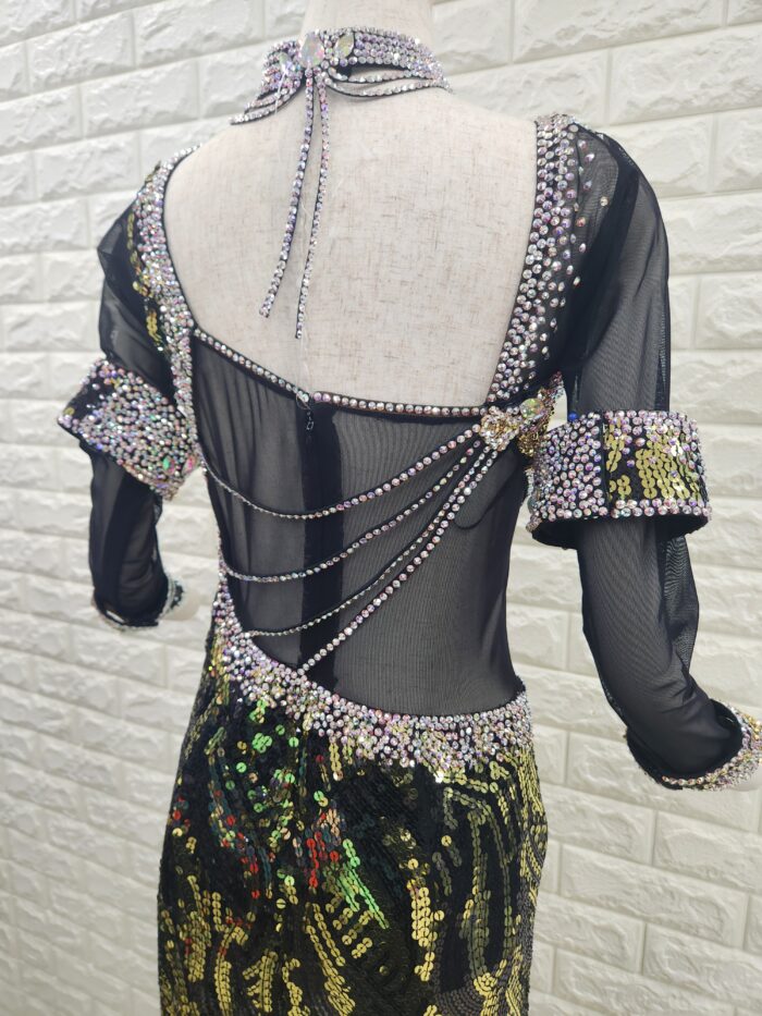 スタッフコメント:購入後、出場機会がなくなってしまったため新品です。とても綺麗です。背中のシースルー部分(ネット)が美しいラテンドレスです。
