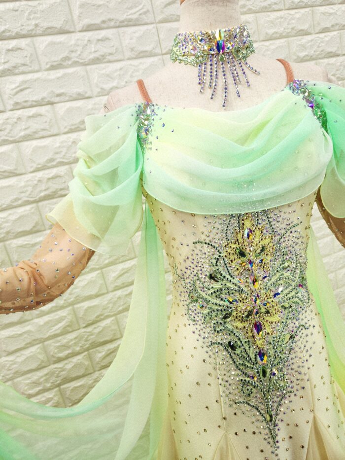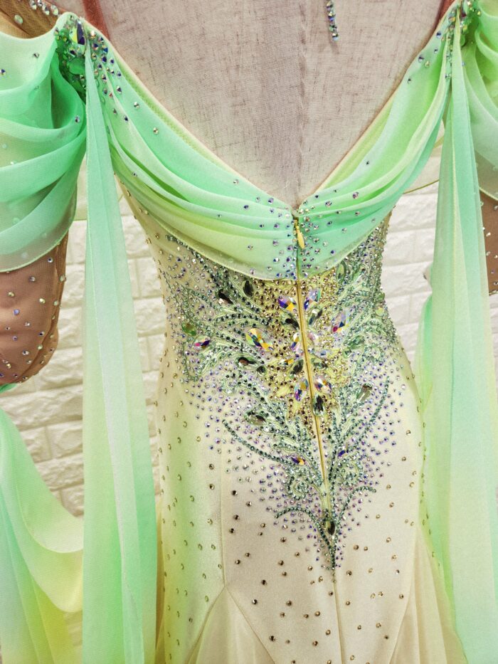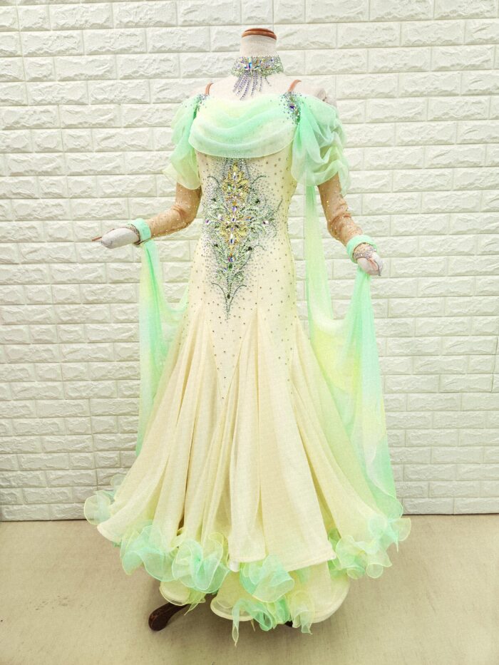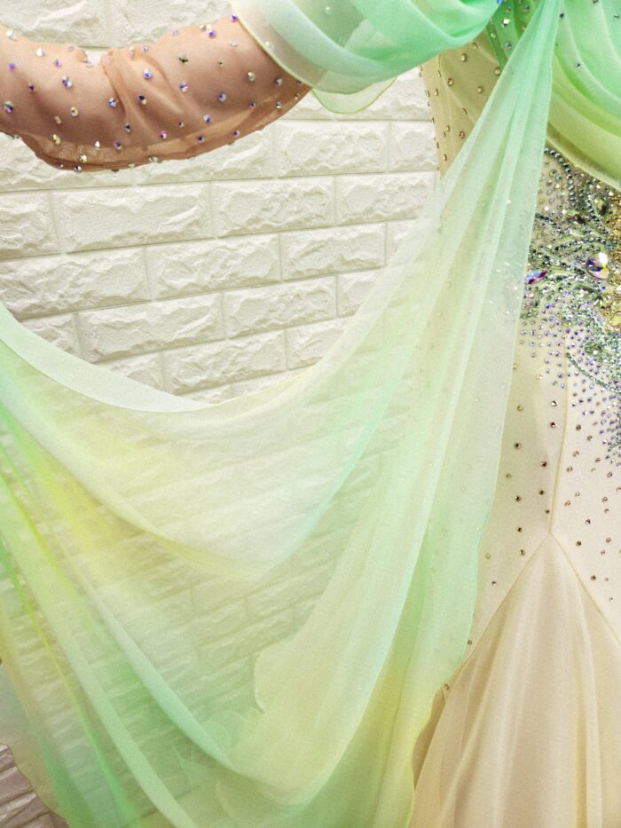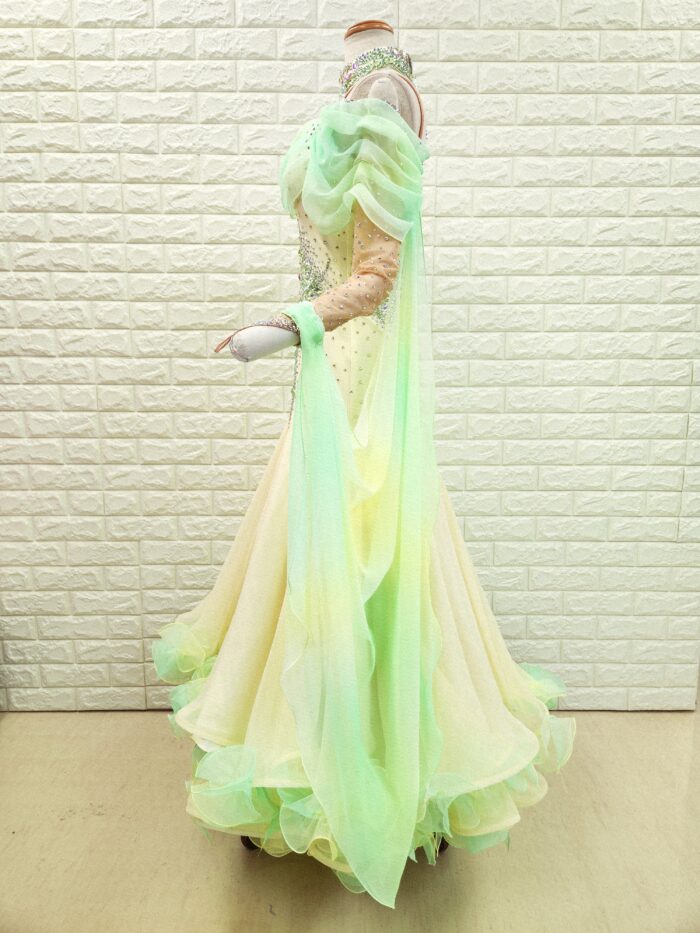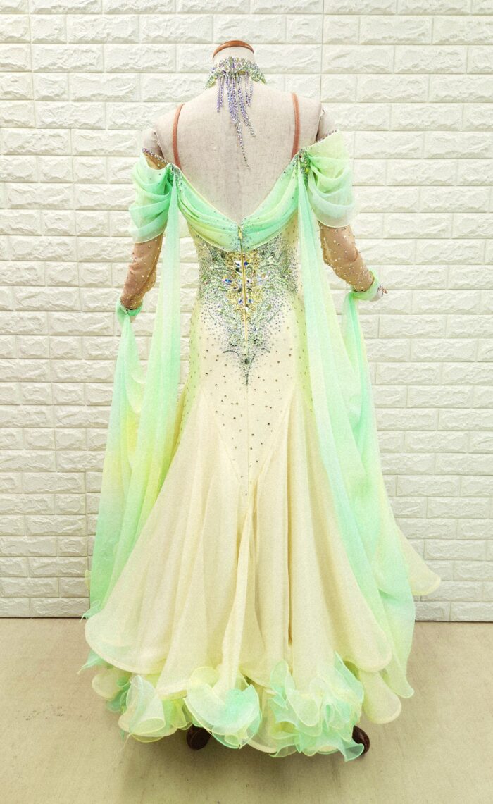スタイル:クリームカラーにうす黄緑のグラデーションジョーゼットが柔らかさを表現してくれるスタンダードドレスでワルツやスローにオススメです。