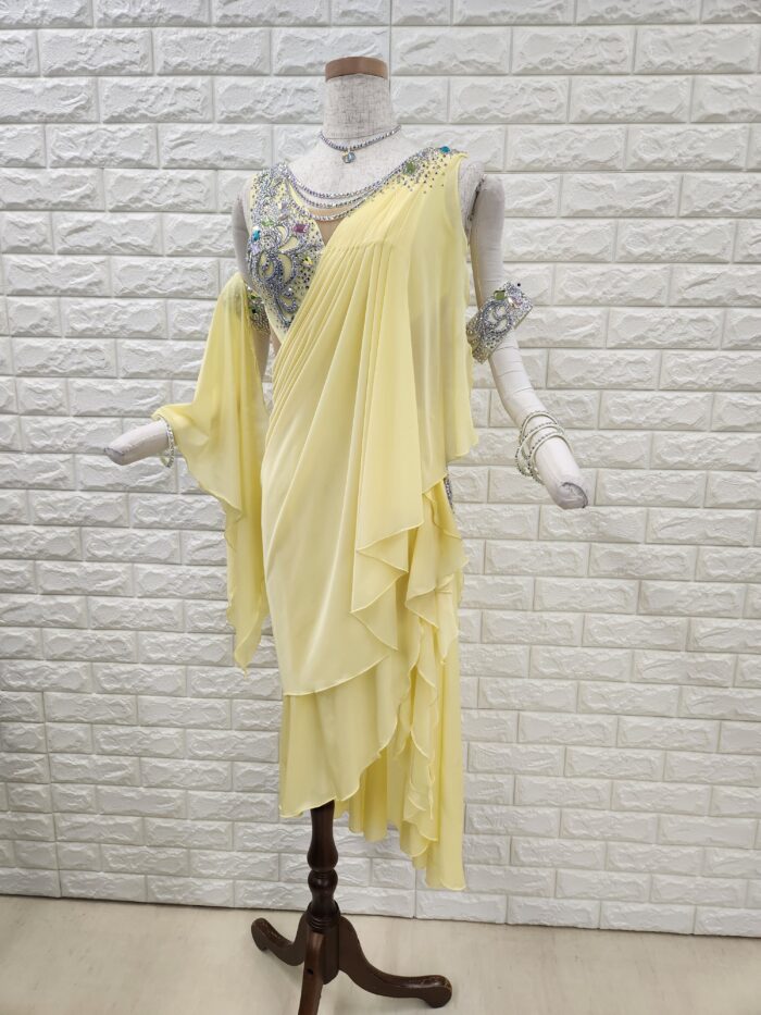 流れるドレープが女性らしさを演出してくれる、とても柔らかな生地で、軽量のラテンドレスとなっております。背中の飾りもポイントです!