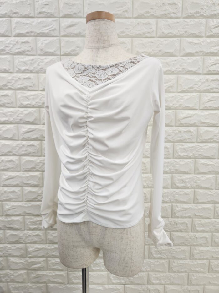 襟元にレースを使用したオシャレな社交ダンス用トップスで前後の中央と袖口にシャーリングを施して細見え効果抜群。
