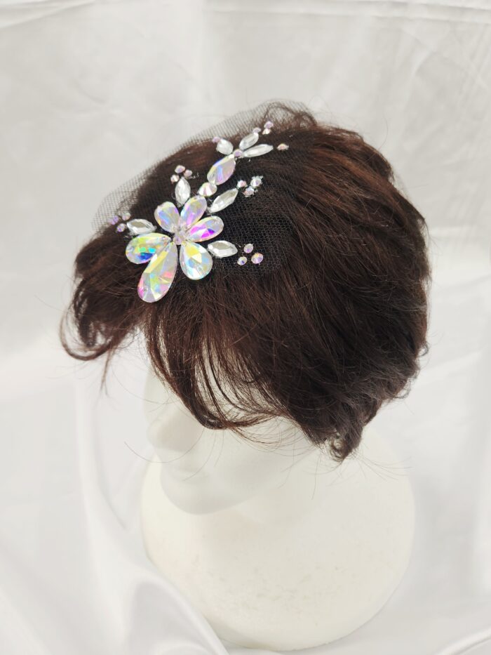 額から分け目に沿って使用できるヘアアクセサリーです。チュールはカットできるので、ご自分のイメージにカットしていただけましたらお好きなところにつける事が可能です。チュール部分にピンでお留めいただければ簡単につける事ができるので便利です。