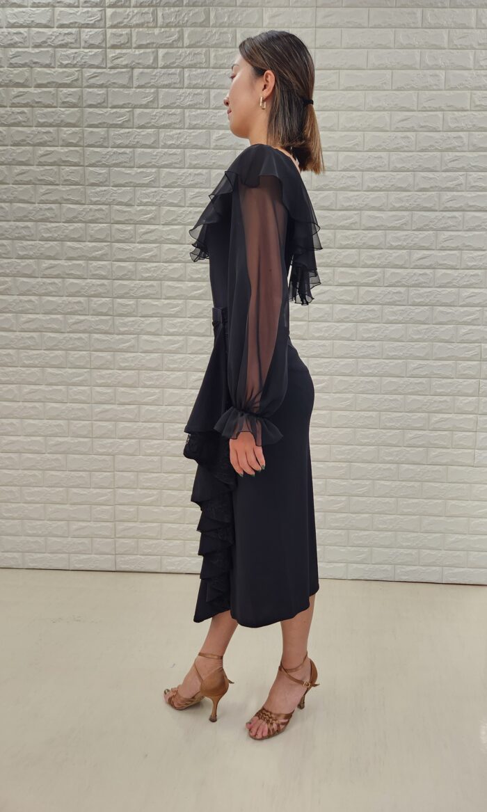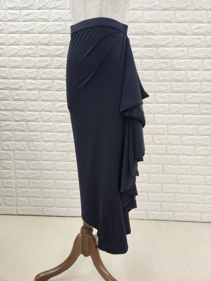 コメント:ウエスト左側にカギホックがついている巻きスカートです。フリル部分にレースを使用しており、踊ると揺れて綺麗なラインです。写真は、T-5と組み合わせて着用しております。
