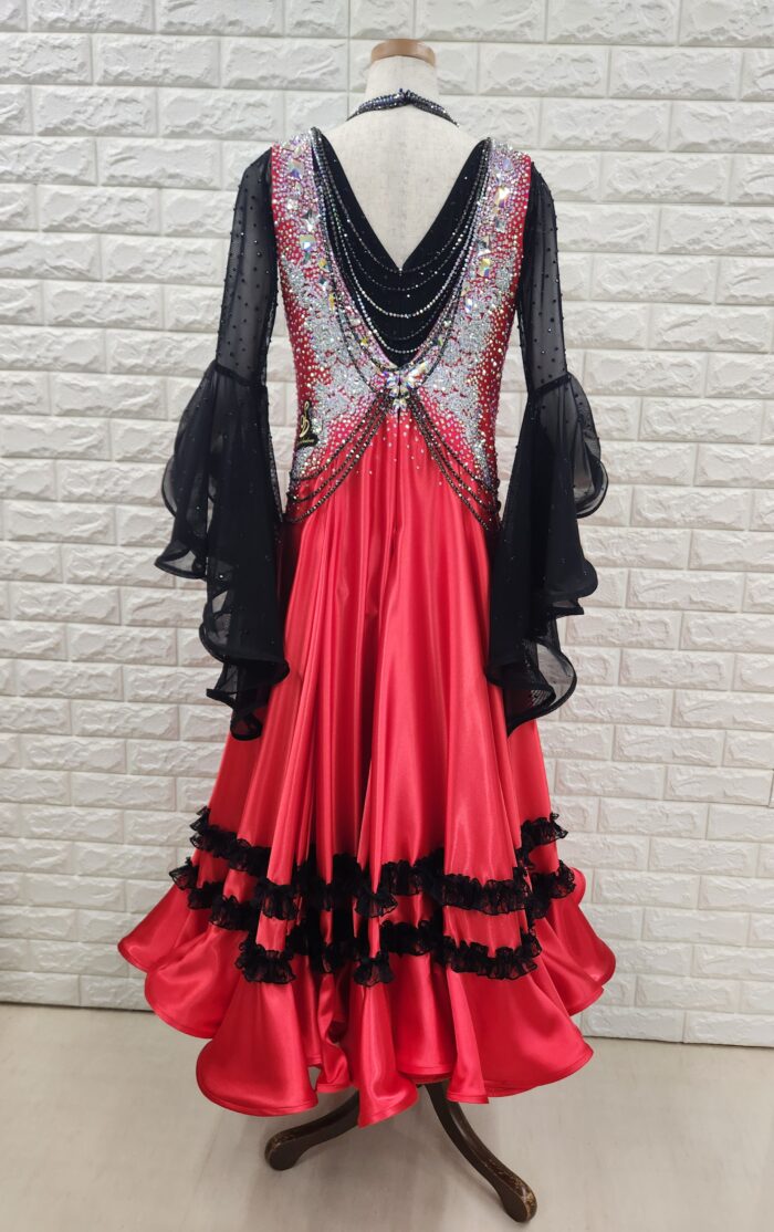 サテンスカートに黒のレースがついた、見た目も鮮やかなパソ用ドレス。胸・背中のVカットがホッソリ効果あり!パソだけでなく、タンゴでもバッチリです。