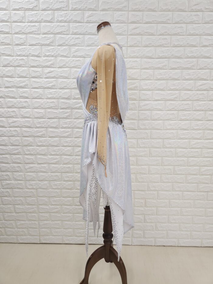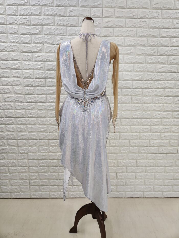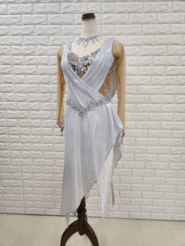ホロのラメ生地(シルバー)が素敵なドレスです。二の腕もカバー(ベージュネット)、露出を抑えたルンバ向きのラテンドレスとなっております。競技・デモでご利用いただけます。