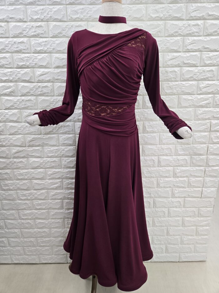 ●スタッフのコメント:ボディーのレースをあしらったシンプルなロングワンピースです。裾に1.5cm巾のホースが入っており、踊った時に動きが綺麗に出ます。パーティーやトライアルにも使用可能です。