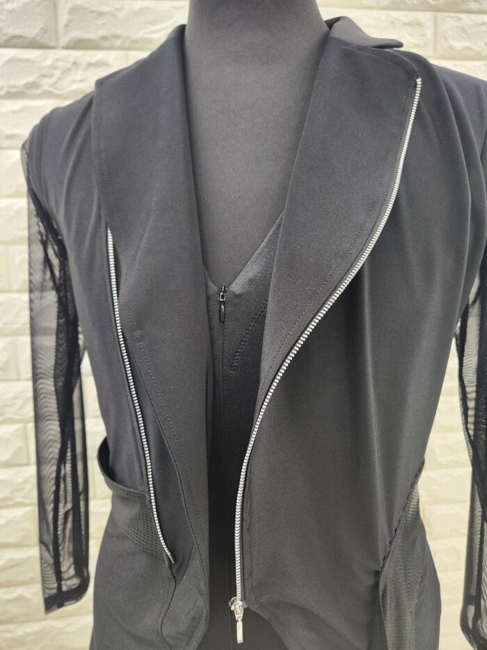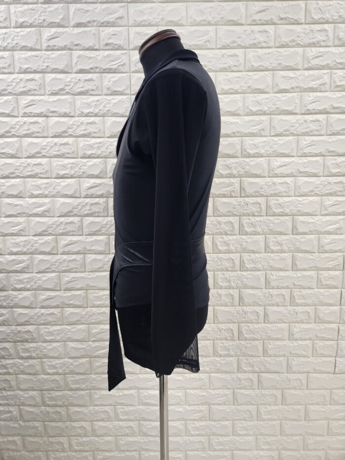 スタッフのコメント:着脱しやすいレオタード式のラテンシャツで、インナー部分はパンツの中に・ジャケット部分はパンツの外側に着用する形となります。縫い付けのベルトの端が踊った時に揺れ、動きを見せてくれます。