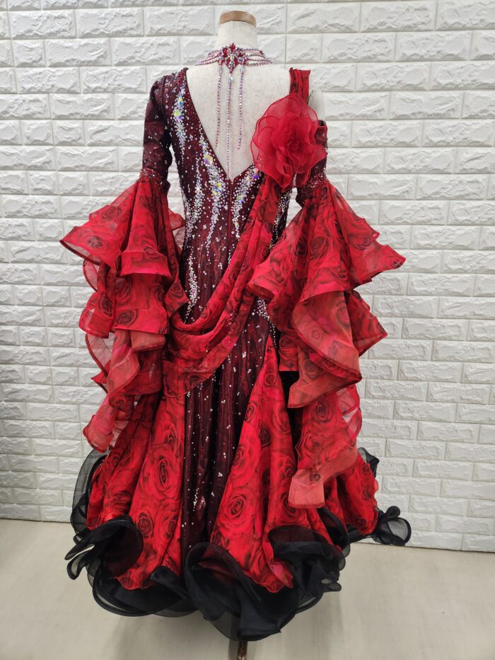 バラ柄のジョーゼットが目を惹きます。袖のフリル部分は取り外せるので、スッキリとさせたい時には外していただいてもいいですね。ボディーに光沢ある生地を使用しているので、お写真映りも最高です。デモンストレーションにオススメ。