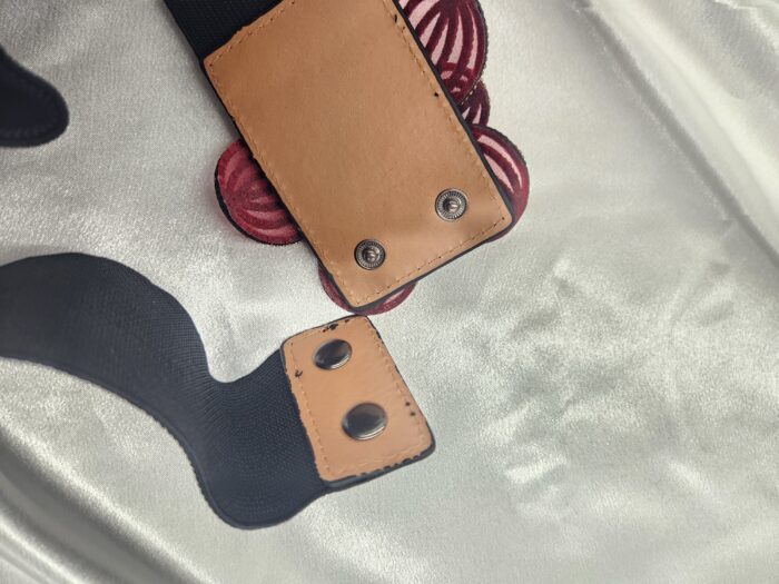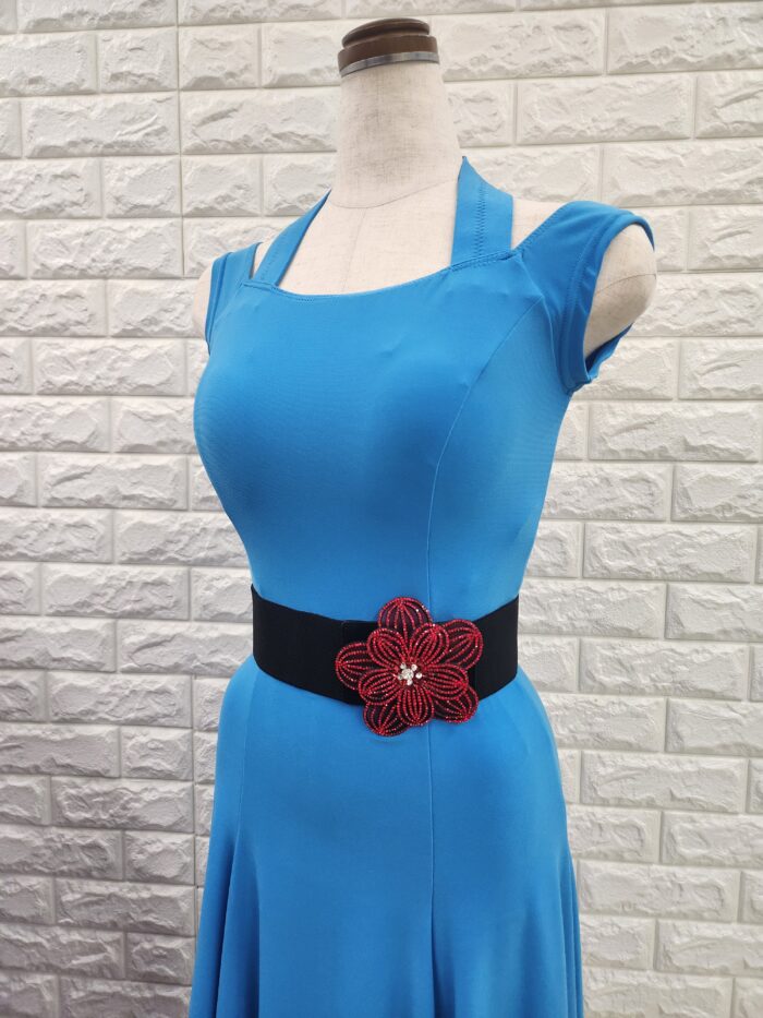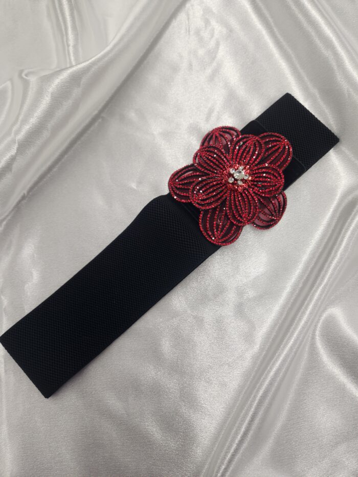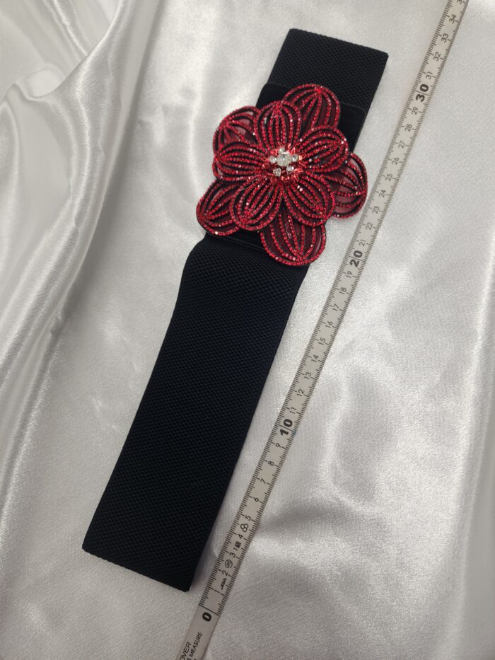 リーズナブルな価格が嬉しいベルト。シンプルなウェア・ドレスに巻くだけで、キラキラ。ちょっと寂しいと思った時に巻くと豪華さが出てきます。赤の花柄ストーンが可愛い!