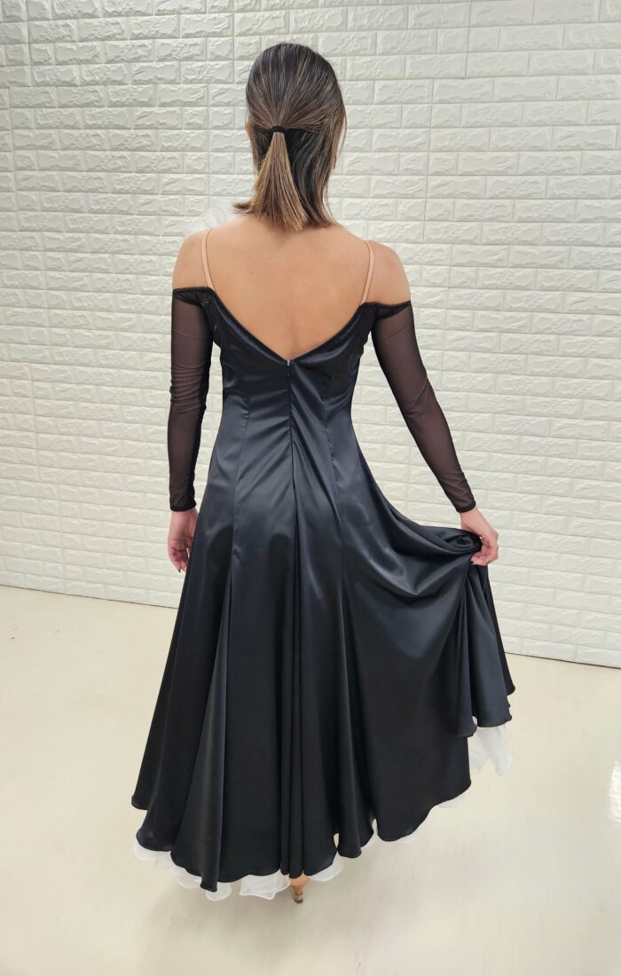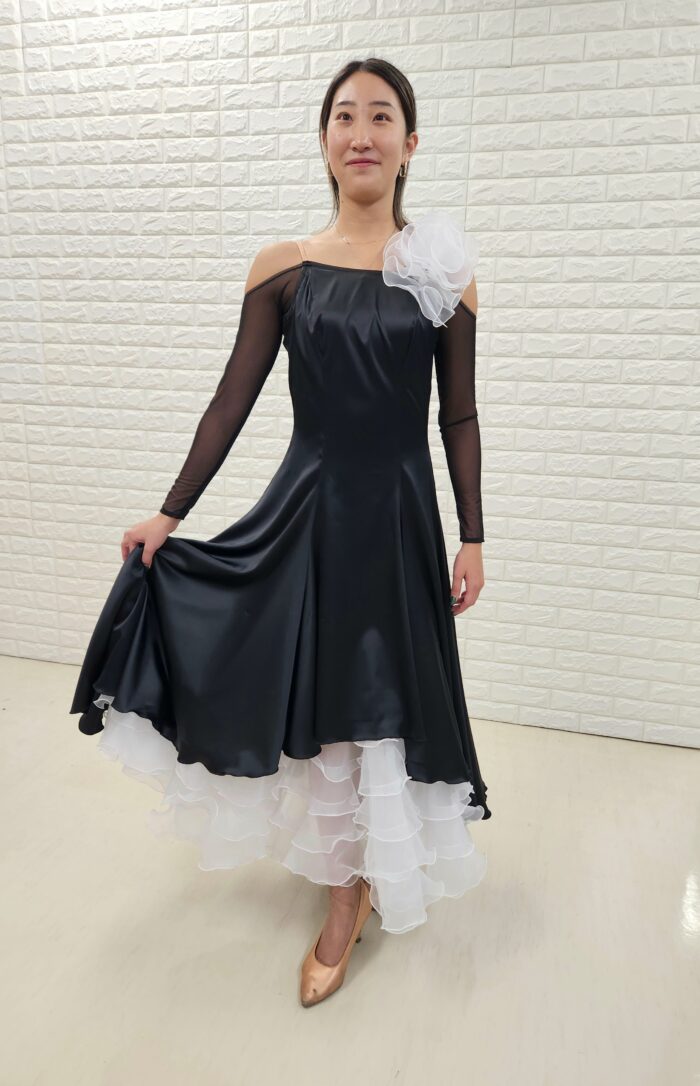 ●スタッフのコメント:高級ラインStylishBlackシリーズの1着です。一般既製のワンピースドレスでは物足りなさを感じている方にオススメの商品です。動きやすさ・フィット感に定評があります。スカート内側のホワイトオーガンジーフリルが踊るたびに大きな動きとなり、ダンスを助けてくれます。