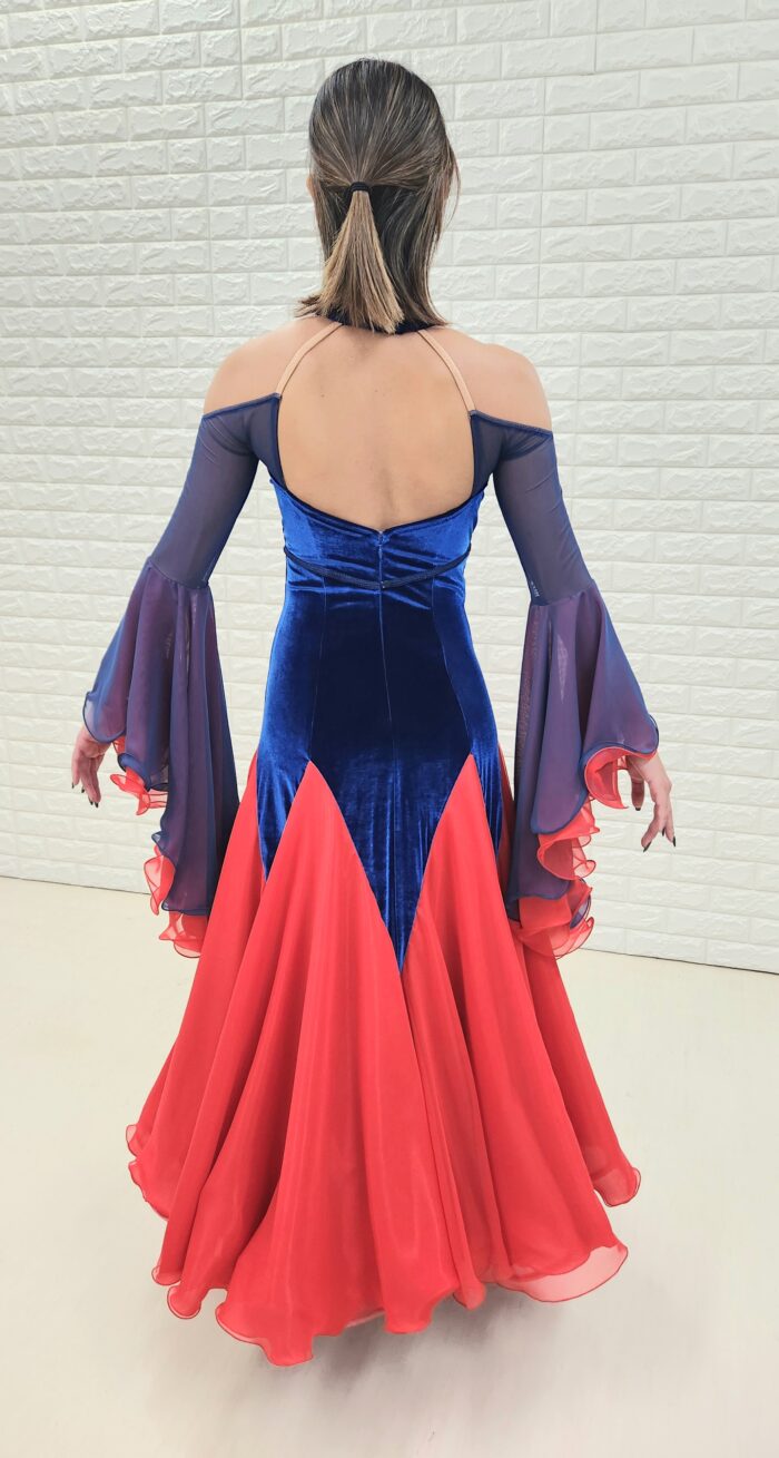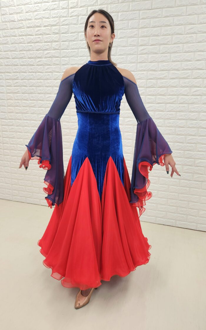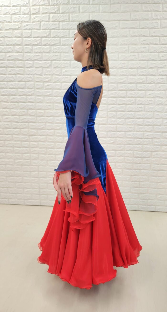 ●スタイル:StylishBlackシリーズ ホルターネックデザインのネイビーベロアとレッドジョーゼットの美しい石無しモダンドレス