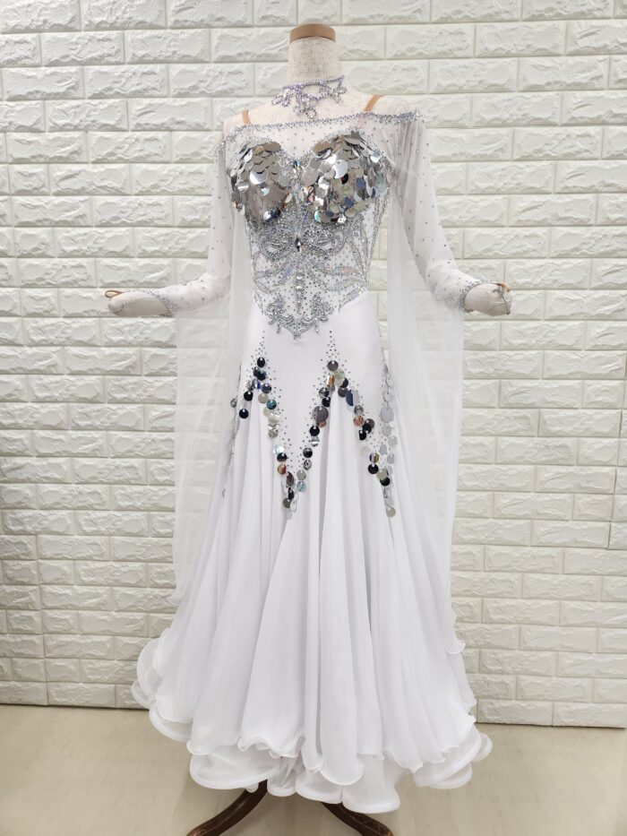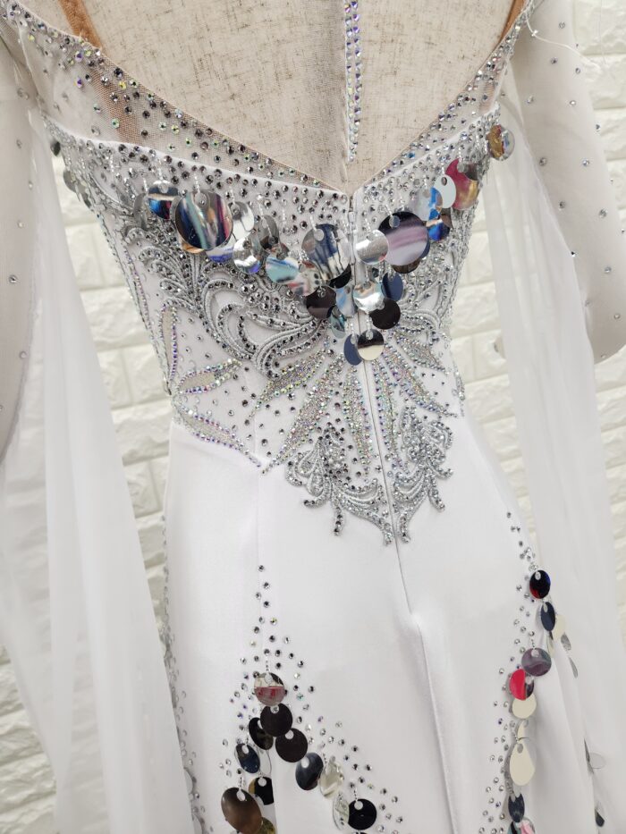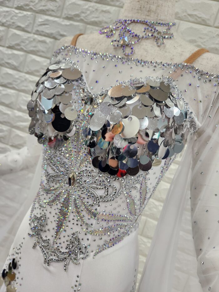 オフショルダーで、ホールドを組んだ時に美しいラインを見せてくれます。白一色ですとおとなしいイメージですが、スパンコールを使用する事により、華やかさが生まれました。